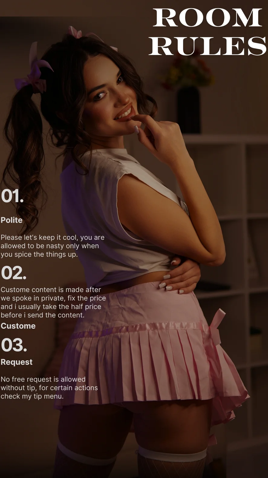 Sub fustă, Twerk, Plesnire, Pantofi cu toc, Flashing, Dans Erotic, Ahegao, Yoga, Topless, Sex între sâni, Striptease, Fumat, Joc de rol, Jucarii Sexuale, Orgasm, Masturbare, Anal, Camel Toe, Evaluare Penisuri, Ejaculare vaginală, Dildo sau Vibrator, Discutii murdare, Pe la spate, Sex oral in adancime, Umilire, Spectacol cu ulei
